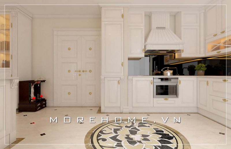Mẫu tủ bếp gỗ tự nhiên màu trắng tân cổ điển sang trọng, thiết bị phòng bếp được thiết kế hiện đại mang đến không gian phòng bếp tiện nghi và sang trọng