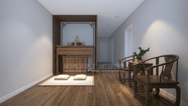 Thiết kế nội thất phòng thờ chung cư CT4 Mỹ Đình tôn nghiêm với đồ nội thất gỗ tông màu nâu sáng.