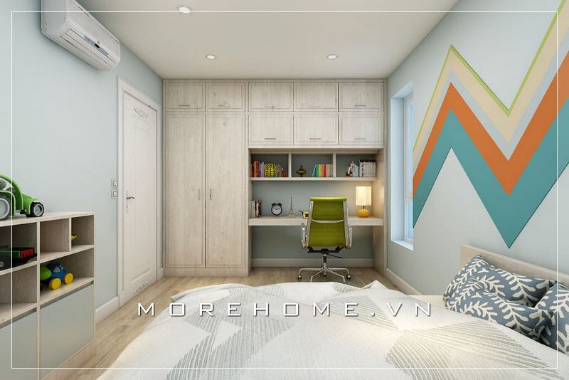 Trang trí nội thất phòng ngủ 2 bé trai với mẫu tủ áo độc đáo kết hợp bàn học hiện đại