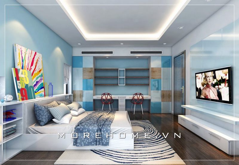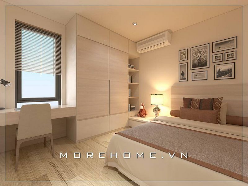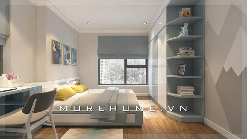 Hệ tủ quần áo hiện đại được thiết kế nối liền với bàn học, tạo hiệu ứng cho căn phòng thêm rộng rãi hơn