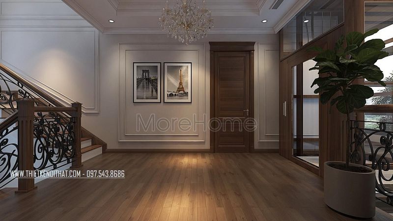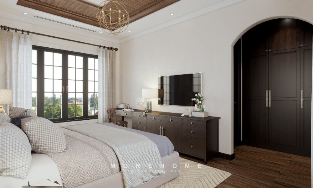 Để phòng ngủ thêm phần sang trọng và lôi cuốn, gia chủ có thể kết hợp ốp sàn gỗ cho phòng ngủ, đèn trang trí, ghế sofa, tạp đầu giường để làm nổi bật căn phòng.