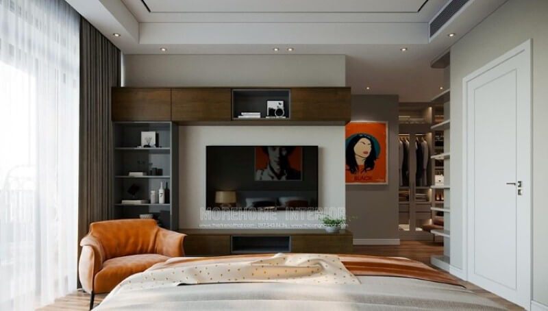 Kệ trang trí, kệ tivi, kệ ốp tường liền mạch tạo nên không gian phòng ngủ gọn gàng khoa học, đẹp mắt.