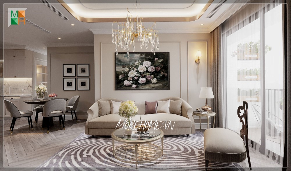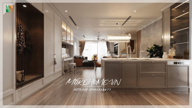 Vẻ đẹp tinh tế từ sắc trắng hiện đại kết hợp đồ nội thất gỗ óc chó cộng hưởng thêm sắc vàng, kem sữa đã tạo vẻ đẹp tinh tế cho không gian phòng khách liền bếp chung cư.