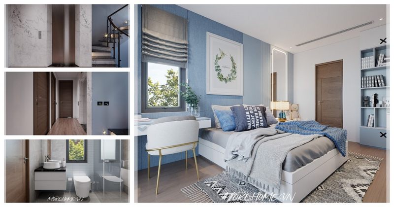 Thiết kế nội thất phòng ngủ nhà phố hiện đại, bàn làm việc được bố trí liền kề với giường ngủ tạo cảm giác thuận tiện và thoải mái nhất cho gia chủ