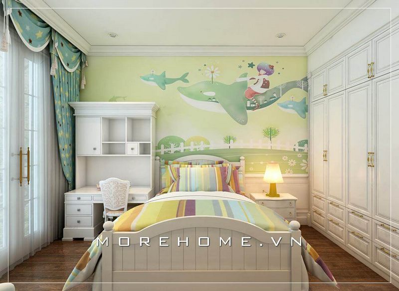 Không gian trẻ em mới, đầy màu sắc và tràn ngập sắc xanh, được tạo nên bởi mẫu giấy dán tường cao cấp Hàn Quốc vân mây 5119-2.