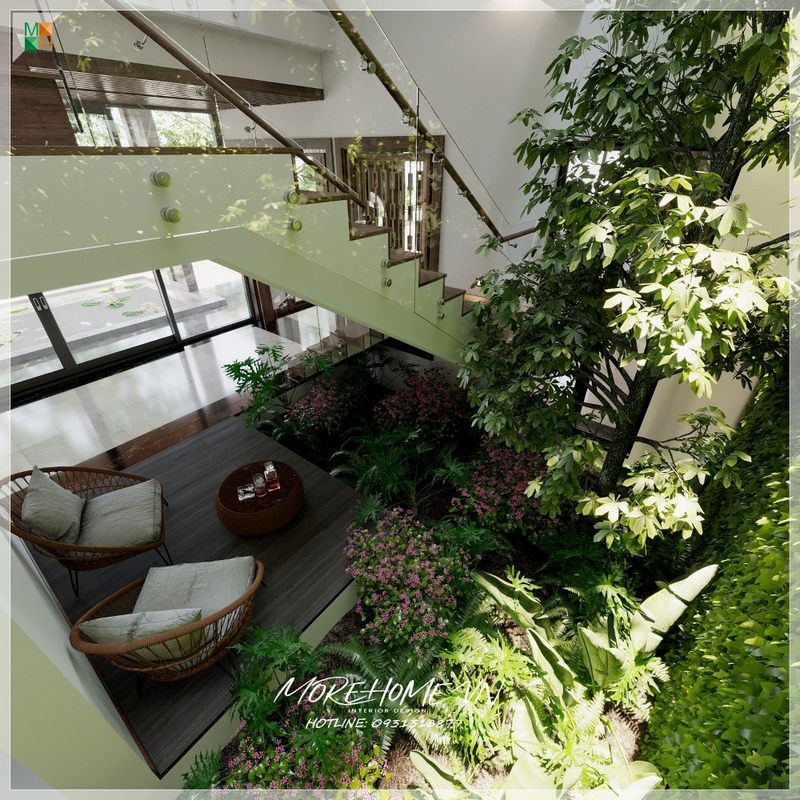 của cây cảnh, hoa lá. Việc thi công nội thất cho nhà phố, biệt thự hiện đại có không gian xanh mát của cây cảnh và hoa lá là nơi lý tưởng để thư giãn, nói chuyện với người thân, bạn bè, nhâm nhi ly trà và tận hưởng bầu không khí trong lành mát mẻ của cây cảnh, hoa lá.